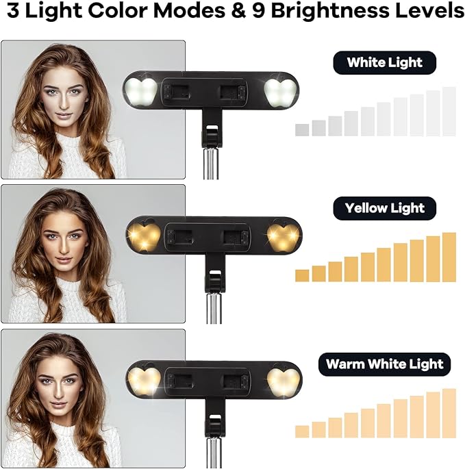 - 3 Lighting Modes &9 Brightness Settings The latest apple-shaped dual lights have 9 brightness levels and 3 lighting modes including white, warm yellow and warm white,This all-in-one technology provides a professional-quality, soft, nearly shadow-free, clean spread of light for photography, video recording, Zoom conferences, live streaming, selfies, and more.